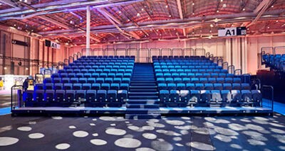 Eine weitere Herausforderung war für uns die dreieckige Geometrie der Halle. Über die geschwungene Form von Treppen und Galerien ist es gelungen, den Raum zu fassen und die Bewegung der Besuchenden zu lenken. Folgerichtig setzt sich der Kreis als Thema in Boden und Decke fort.